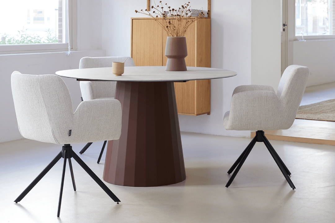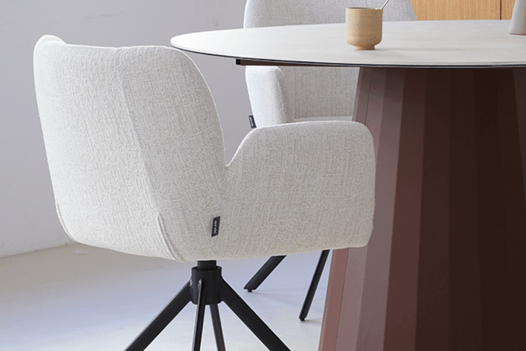 Tussen de Selected-opties vind je vier beschikbare kleuren in zachte chenille stof of bouclé. Kies voor meer bewegingsvrijheid met de zwart metalen draaivoet als onderstel. Of houdt juist voet aan de grond met het vaste frame, ook in zwart metaal.