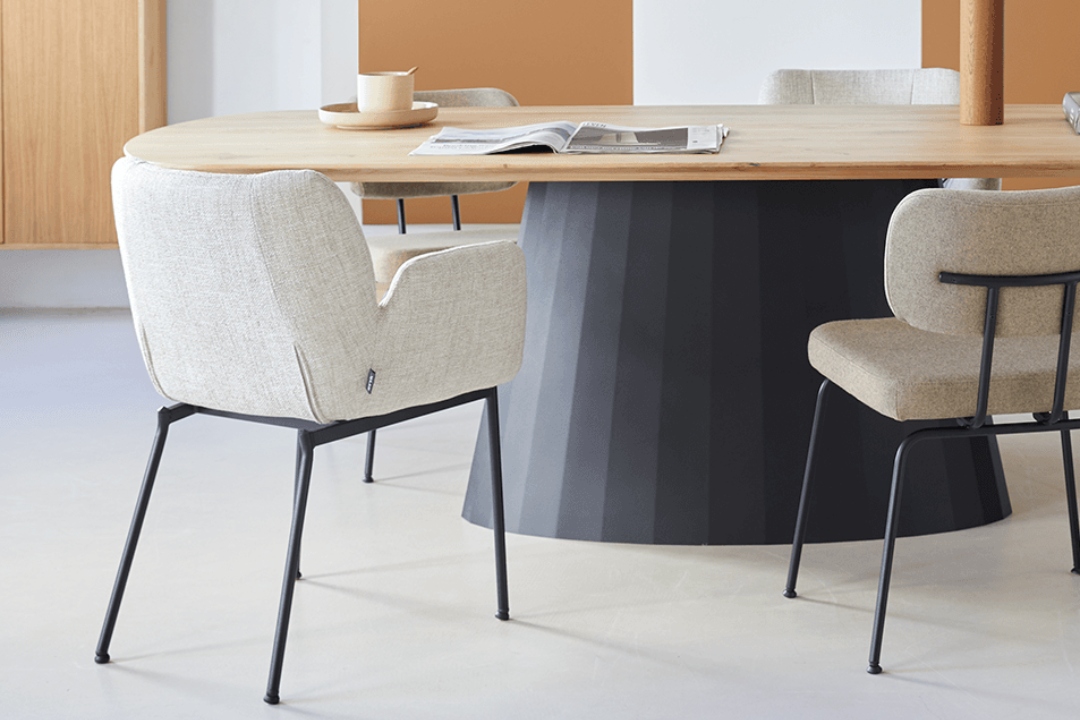 Tussen de Selected-opties vind je vier beschikbare kleuren in zachte chenille stof of bouclé. Kies voor meer bewegingsvrijheid met de zwart metalen draaivoet als onderstel. Of houdt juist voet aan de grond met het vaste frame, ook in zwart metaal.